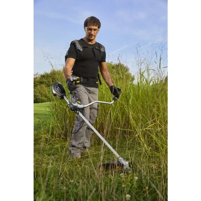 Krachtige prestaties. Evenwichtig gebruik. Met amper 6 kg en de accu's vastgeklikt in het draagharnas maait u moeiteloos hoog gras en onkruid met de SBC 900 D AE. Deze draadloze bosmaaier is uitgerust met verstelbare, dubbele bike-handgreep. De brushless 1 kW inductiemotor aangedreven door een paar E-Power 48V 7.5Ah batterijen in het SBH 900 batterijharnas levert een lange werktijd van 70 minuten. Extra vermogen nodig? Trek de ingewerkte gashendel in voor onmiddelijke versnelling.